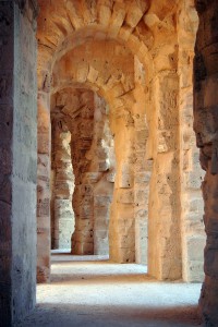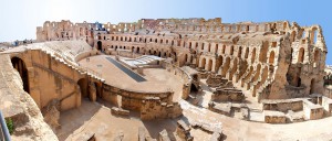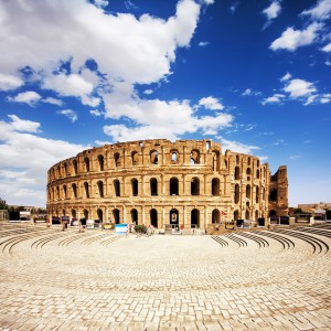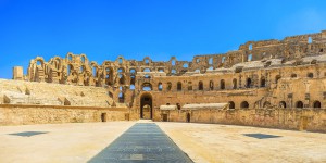 Au coeur de la Tunisie, l’amphithéâtre d’El Jem, construit en pierre de taille, reprend le modèle du Colisée de Rome sans en être une simple copie conforme. Mesurant 149 mètres de long sur 124 de large, le monument se classe à la septième position des plus grands amphithéâtres du monde.