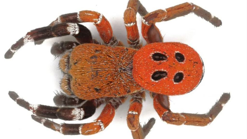 Les araignées coccinelles, nommées ainsi en raison de leur délicate robe rouge parsemée de points noirs, présentent habituellement un coloration sombre au niveau de la tête. Chez la nouvelle espèce, les poils recouvrant cette partie du corps, ainsi que les chélicères (pièces buccales) sont d’un rouge éclatant.