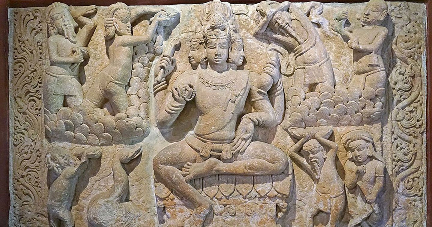 Souhaitant créer l’Univers, Brahman a d’abord créé l’eau dans laquelle il a placé sa graine. Cette graine s’est transformée en un œuf d’or d’où Brahma est apparu. C’est notamment pour cette raison que Brahma est également connu sous le nom de Hiranyagarbha. Brahma est né avec quatre têtes et on pense qu’elles sont issues des quatre Vedas, les textes religieux les plus anciens pour les hindous. Il a également quatre bras, et est généralement représenté avec une longue barbe.