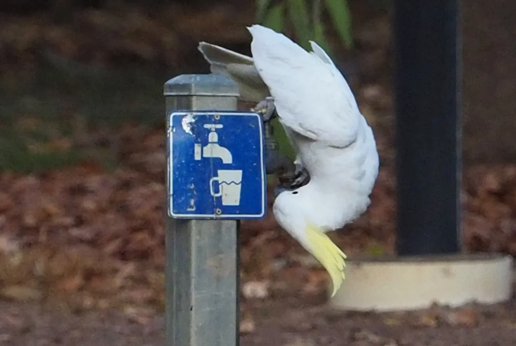 Pour la toute première fois, des cacatoès à huppe jaune ont été vus en train d’utiliser leurs pattes et leur corps pour tourner le robinet d’une fontaine à eau afin de s’hydrater. Une scène inédite au sein d’une importante population d’oiseaux. Explications.