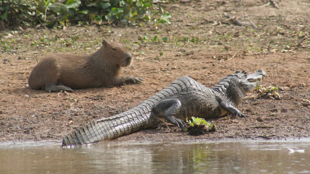 Plus grand rongeur actuel, le capybara est régulièrement observé se prélassant près de caïmans. Bien que les attaques ciblant les adultes restent peu fréquentes, cela ne signifie pas pour autant qu’ils ne courent aucun risque.