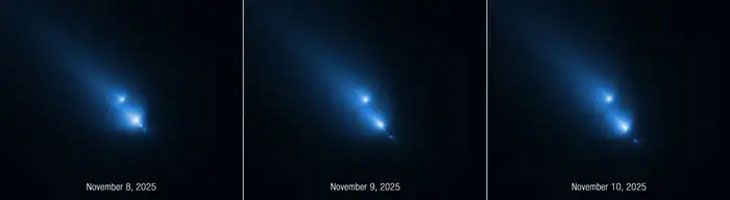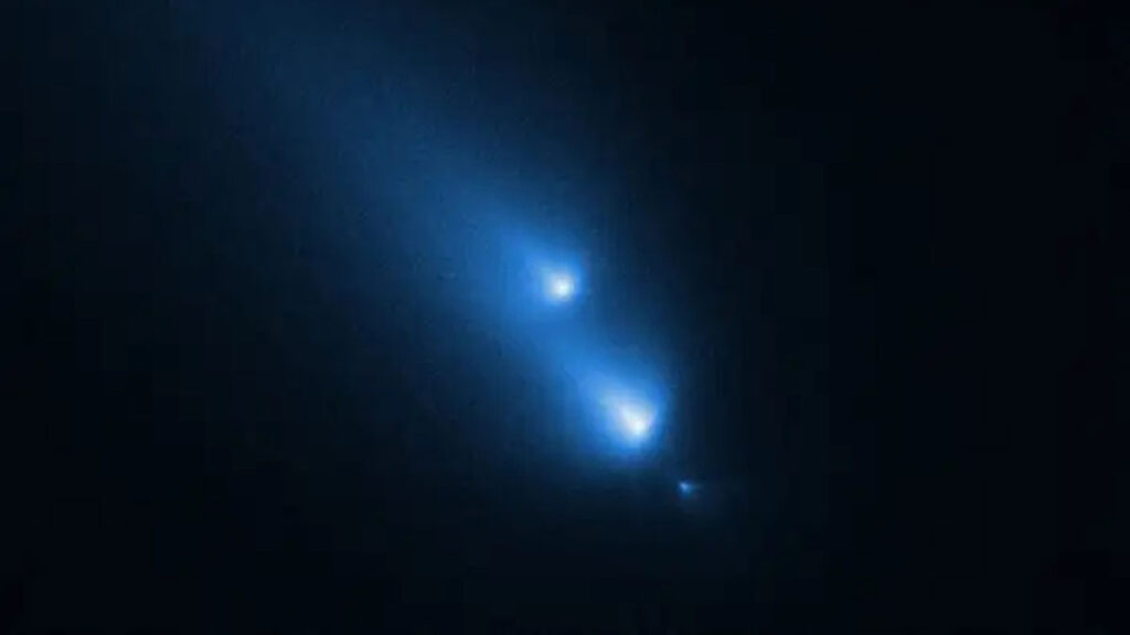 Initialement, John Noonan, de l’université d’Auburn, et ses collègues avaient prévu d’observer une autre comète avec Hubble, mais sa capacité de rotation limitée les a contraints à se rabattre sur une nouvelle cible : C/2025 K1 (ATLAS). Les images du télescope de la NASA ont révélé qu’elle s’était fraîchement disloquée, avec au moins quatre fragments clairement visibles.