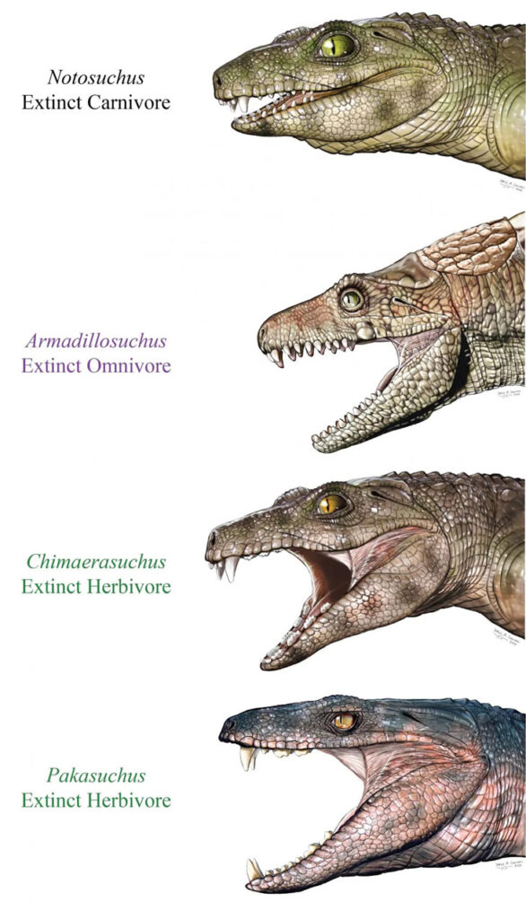 Il s’est avéré qu’une partie des 16 espèces préhistoriques étudiées présentait des caractéristiques dentaires typiques des herbivores. Les plus anciens exemples remontaient à la fin du Trias (il y a environ 200 millions d’années), et les plus récents à celle du Crétacé (il y a 66 millions d’années), marquant la fin du règne des dinosaures non-aviens. Durant cette période plutôt longue, l’équipe a déterminé que l’herbivorisme avait évolué indépendamment à au moins trois reprises chez ces anciens crocodyliformes.