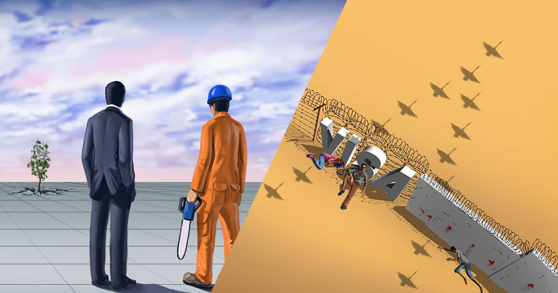 Une image vaut parfois mieux que mille mots. C’est avec cet adage en tête que M. Aghayev use de l’art pour critiquer et dénoncer les situations les plus honteuses de nos sociétés modernes. Parfois gores, parfois choquants, ses dessins reflètent tout son amertume et toute sa colère.