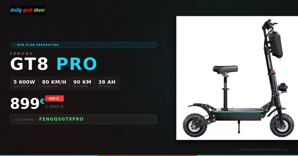 La FENGQS GT8 PRO s’impose comme l’une des trottinettes électriques les plus puissantes du marché avec ses deux moteurs de 2800 W. Grâce à un code promo exclusif sur Geekbuying, elle chute à 899 € au lieu de 1 099 €, soit 200 € de remise immédiate. À ce tarif, elle surclasse nettement l’Ausom DT2 PRO sur pratiquement tous les critères techniques.