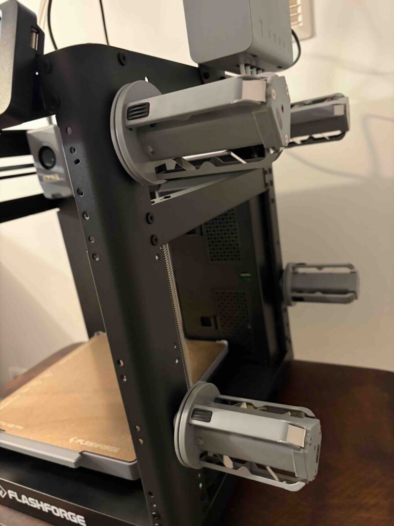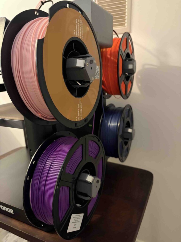 Le module multi-filaments, capable d’accueillir quatre bobines, se connecte à l’imprimante pour gérer automatiquement les changements de couleur. L’intégration est propre et cohérente.