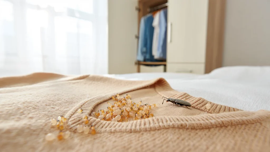 Une femelle peut pondre jusqu’à 200 œufs dans un recoin de placard ou sous un meuble. Une fois écloses, les larves se nourrissent pendant des mois avant de se métamorphoser. Le pire ? Elles laissent peu de traces visibles, mis à part quelques trous et des fibres grignotées. Résultat : on s’en rend compte souvent trop tard.
