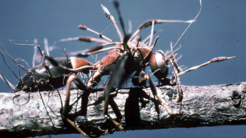 Au cours des jours suivant la mort de l’insecte, ces parasites se développent à l’intérieur et à l’extérieur de sa carcasse. Des tiges finissent par en émerger et libèrent des spores qui vont contaminer d’autres fourmis.