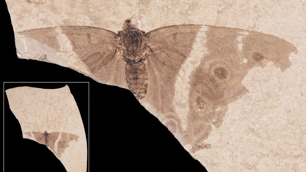 Comme le précise l’étude, publiée dans la revue Acta Palaeontologica Polonica, la majeure partie de l’aile droite et de larges portions de l’aile gauche sont conservées, avec une nervation complète et des motifs clairement reconnaissables, y compris des ocelles (taches arrondies). La tête et le thorax sont également visibles, et une grande partie de l’abdomen préservée.