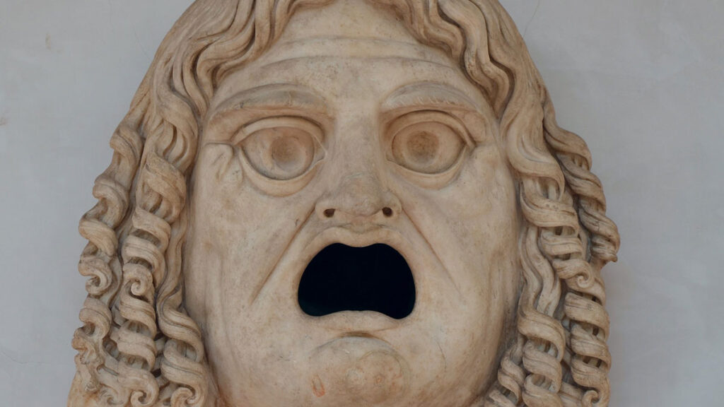 La cavité où l’huile aurait été versée constituait la bouche grande ouverte d’une figure mythologique que les chercheurs pensent être Bacchus (pendant romain de Dionysos), dieu du vin, de la fête et des arts théâtraux. L’expression caricaturale du visage, surmonté d’une grande feuille, rapproche l’objet des masques tragicomiques que portaient les acteurs grecs et romains pour accentuer leurs expressions ou changer de personnage.