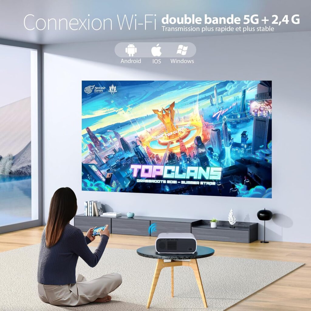 Ce mini projecteur est équipé du Wi-Fi et du Bluetooth. Il intègre deux haut-parleurs de 5 W qui vous permettront de profiter d’une expérience audiovisuelle de qualité sans avoir besoin d’un appareil audio externe.