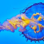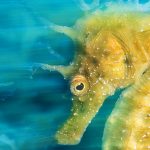Cet hippocampe jaune pastel est lumineux dans cette eau turquoise. Cette photographie sous-marine crée une …