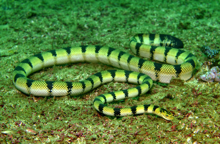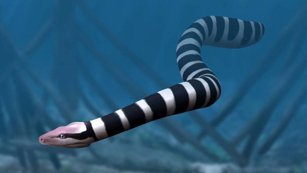 Aujourd’hui, la plus grande espèce de serpent de mer connue est Hydrophis spiralis. Mesurant près de 3 mètres de long à l’âge adulte, ce membre de la famille des élapidés est reconnaissable à sa robe jaune striée d’une quarantaine d’anneaux sombres. Il se rencontre dans le nord de l’océan Indien et l’ouest du Pacifique.