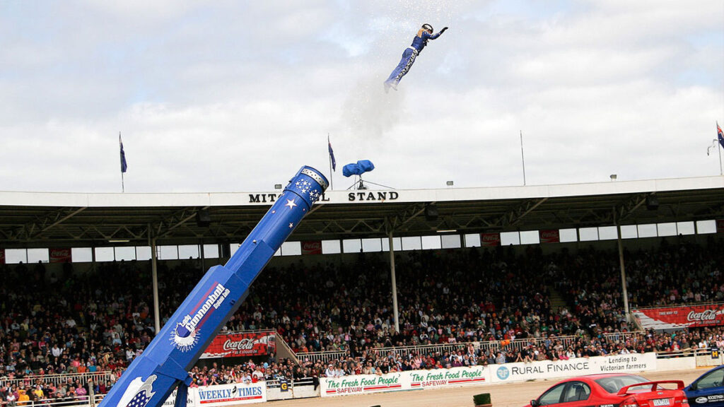 LES HOMMES-CANONS SONT PROJETÉS DANS LES AIRS À 110 KM/H, PEUVENT PARCOURIR UNE DISTANCE DE 60 MÈTRES ET ATTEINDRE UNE HAUTEUR DE 21 MÈTRES DURANT LEUR VOL