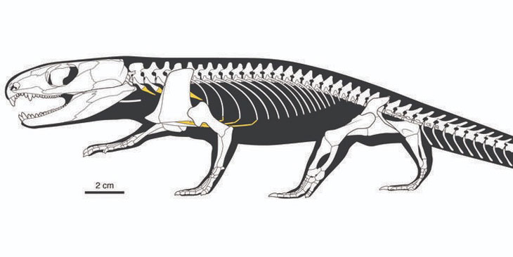 Anatomie squelettique de Captorhinus aguti (avec les fossiles étudiés en jaune pâle) — © Reisz et al. / Nature 2026