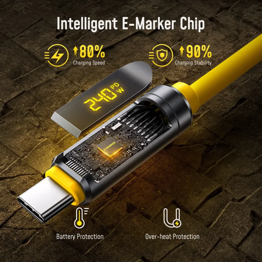 Le câble lui-même reprend cette identité. La gaine est robuste, visuellement qualitative, avec un toucher rassurant. Les connecteurs USB-C sont larges, solides, et intègrent un petit écran LED. C’est un détail qui change tout à l’usage, car il permet de visualiser instantanément la puissance délivrée. Une information souvent réservée aux chargeurs, rarement aux câbles.