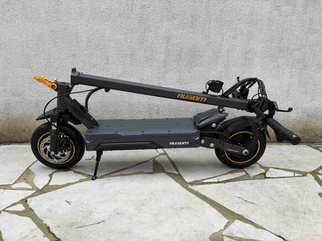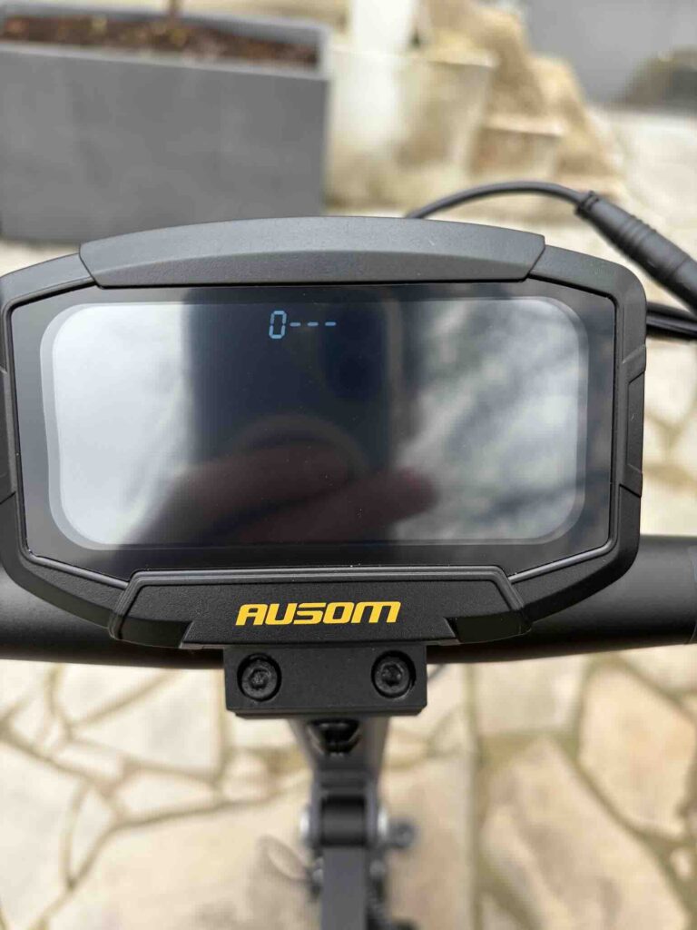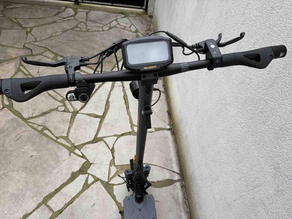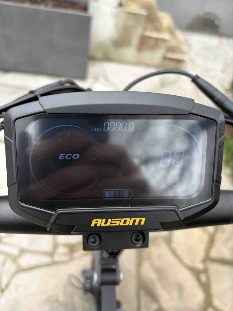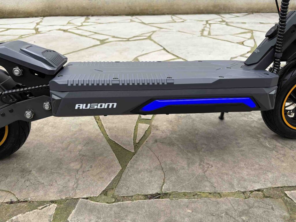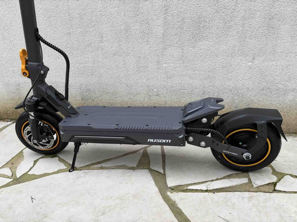 Le système de freinage combine E-ABS et freins à disque mécaniques à l’avant et à l’arrière. Le feeling est progressif et rassurant : dès que vous serrez la gâchette, le moteur coupe instantanément, et la décélération est franche sans être agressive. En situation d’urgence, les distances d’arrêt restent courtes et maîtrisées. C’est un point crucial, surtout à des vitesses supérieures à 40 km/h, et Ausom a clairement fait le bon choix d’équipement ici.