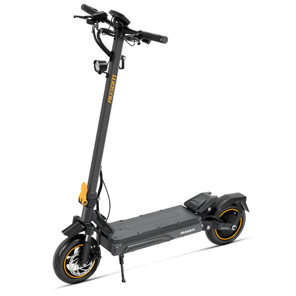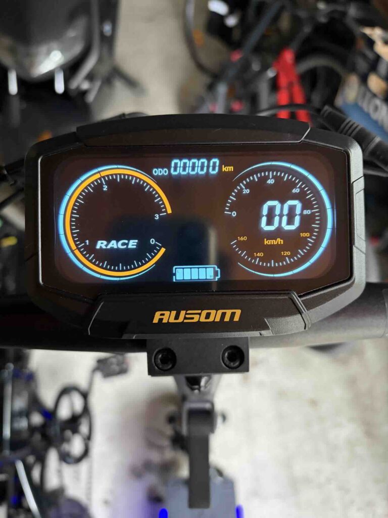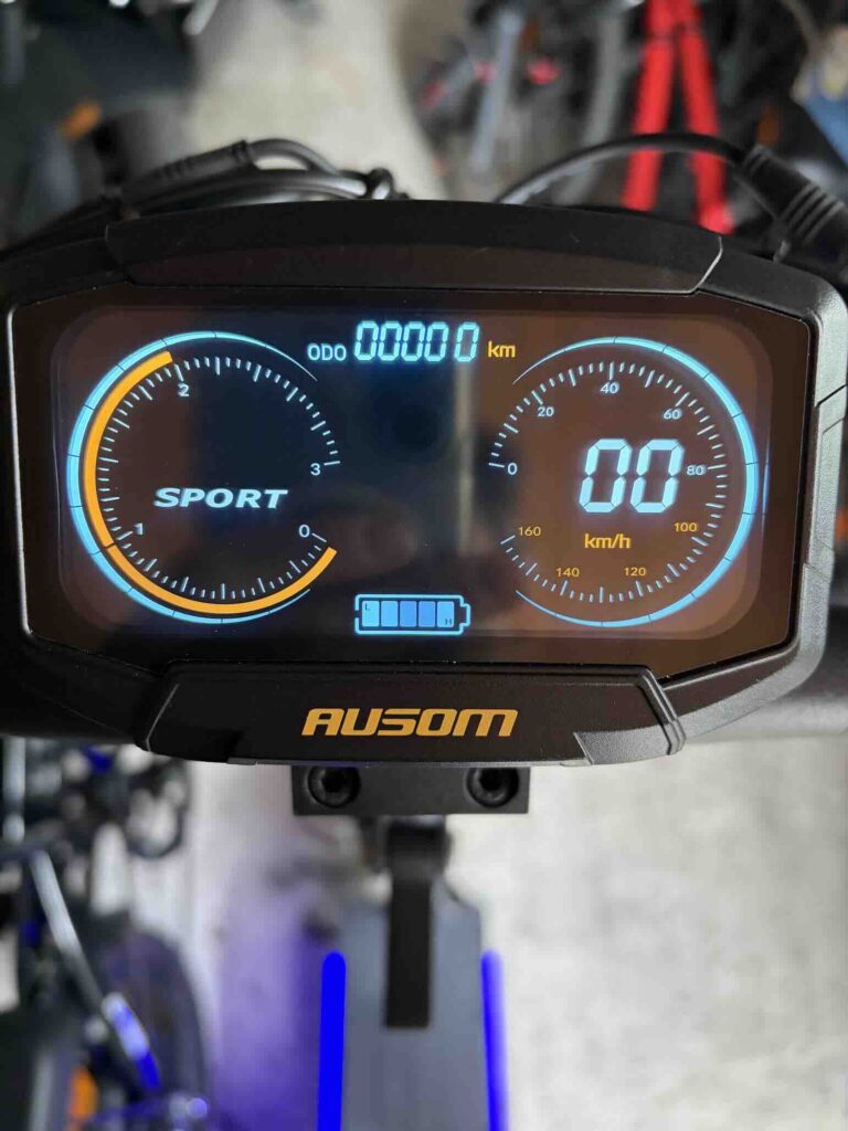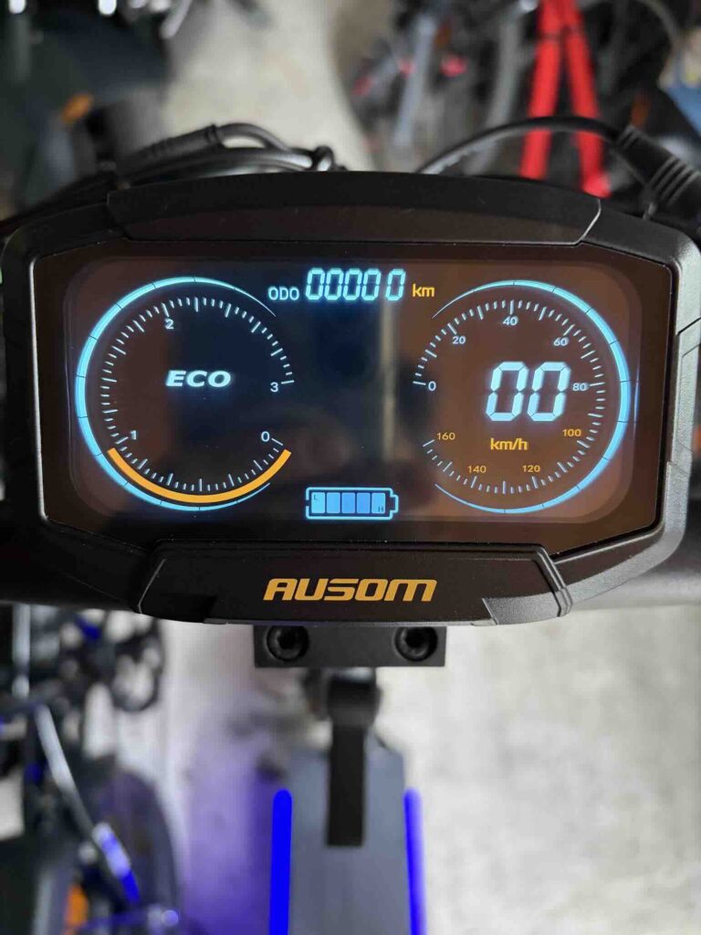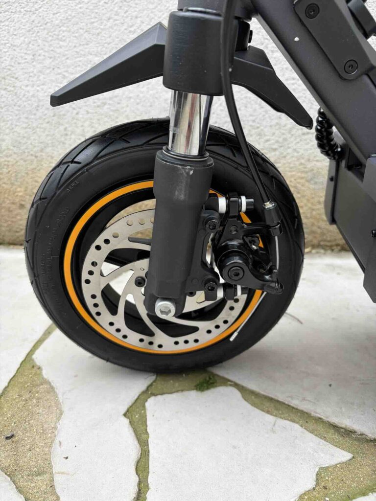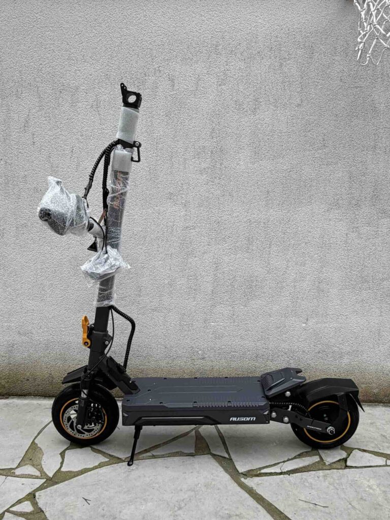 Le système de freinage combine E-ABS et freins à disque mécaniques à l’avant et à l’arrière. Le feeling est progressif et rassurant : dès que vous serrez la gâchette, le moteur coupe instantanément, et la décélération est franche sans être agressive. En situation d’urgence, les distances d’arrêt restent courtes et maîtrisées. C’est un point crucial, surtout à des vitesses supérieures à 40 km/h, et Ausom a clairement fait le bon choix d’équipement ici.
