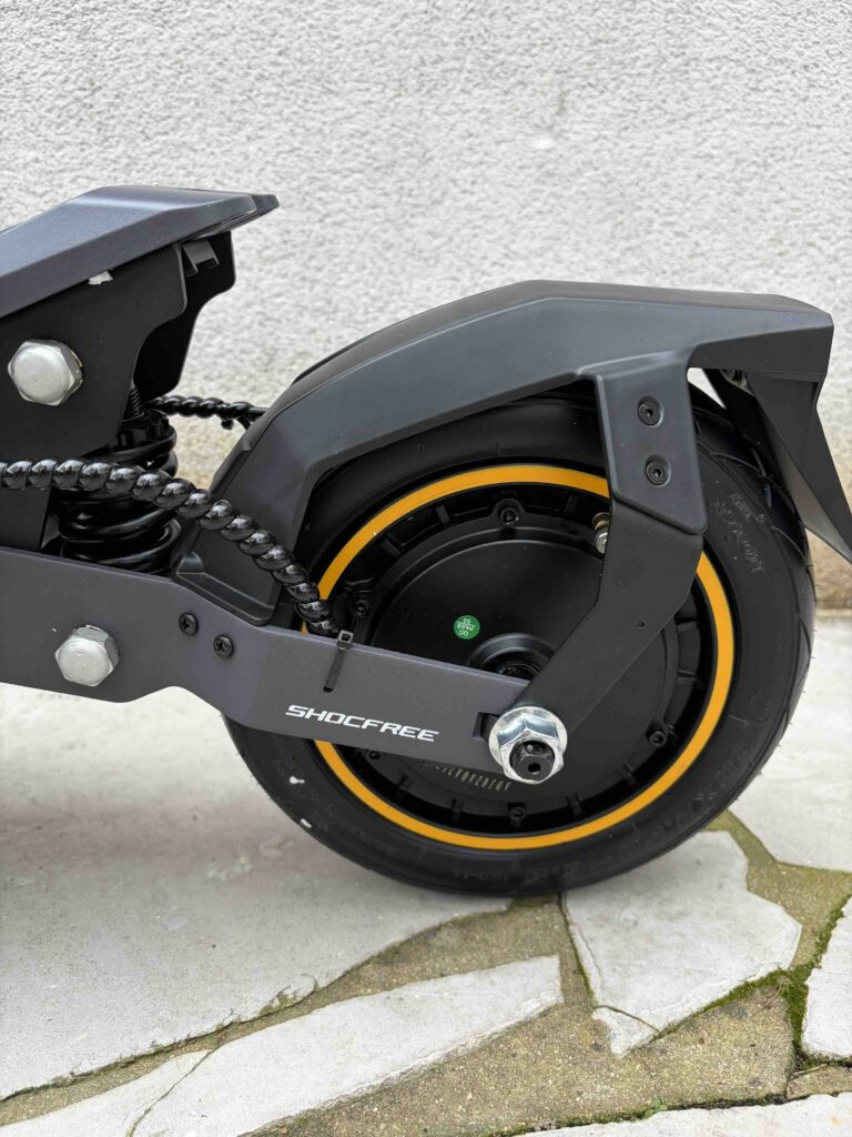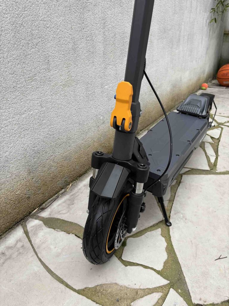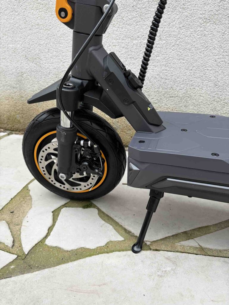 C’est l’un des points qui nous a le plus impressionnés. Avec sa certification IP54 (batterie IPX5), nous avons roulé sous plusieurs averses sans aucun souci technique. Mais au-delà de l’étanchéité, c’est la tenue de route sous la pluie qui est remarquable : les pneus tubeless accrochent bien sur l’asphalte mouillé, et le freinage (E-ABS + disques) reste prévisible et progressif. Pas de sensation de glisse ni de perte de contrôle. Pour une trottinette à ce prix, c’est un vrai point fort par rapport à la concurrence.