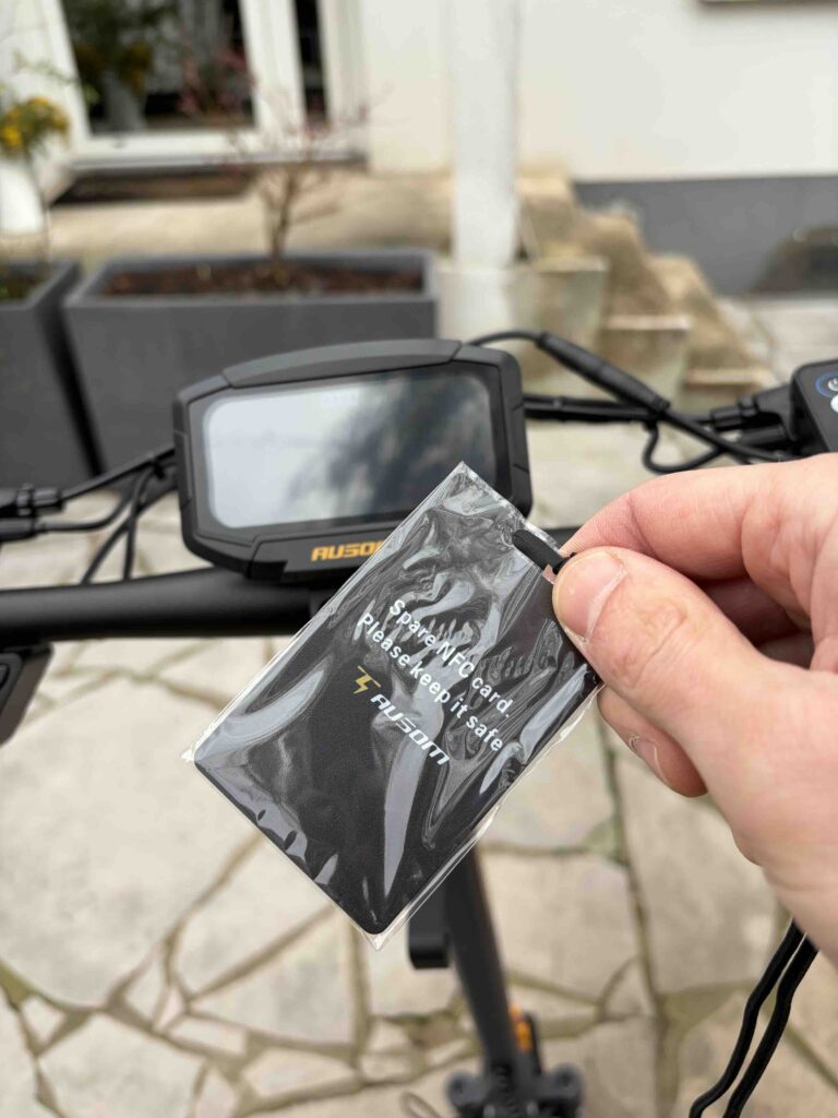 L’Ausom K20 Pro embarque un triple système de déverrouillage : carte NFC (trois cartes fournies), NFC smartphone ou code PIN via l’écran. En pratique, c’est un vrai confort au quotidien : un tap de la carte ou du téléphone et vous roulez. Impossible de démarrer la trottinette sans authentification, ce qui en fait un antivol intégré efficace. On retrouve un système similaire sur la iScooter iX6, mais l’ajout du NFC smartphone est un plus appréciable.