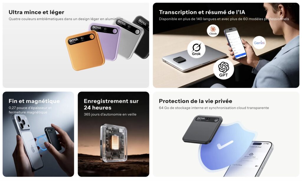 Et si un boîtier plus petit qu’une carte bancaire pouvait enregistrer vos réunions, vos appels et même le son de vos écouteurs Bluetooth, puis tout transformer en compte-rendu structuré grâce à l’IA ? C’est exactement ce que promet la marque Boya nous avons testé des microphone BOYA LINK 3, Boya Magic et BOYA Mini testons maintenant le BOYA Notra AI, premier enregistreur vocal à proposer un triple mode d’enregistrement (ambiant, appels, casque). Après 10 jours de test intensif rendez-vous clients, visites de lieux en intérieur comme en extérieur je peux vous dire que ce petit gadget ne m’a tout simplement plus quitté. Voici notre verdict complet.