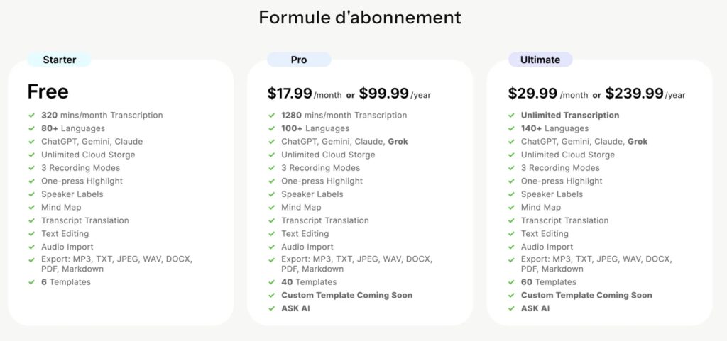 | IA & transcription | ChatGPT, Gemini, Claude, Grok — 140+ langues, résumés, mind maps |