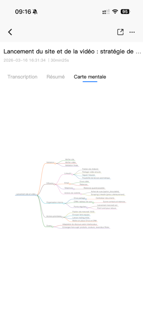 En pratique, la transcription en français est très satisfaisante sur des enregistrements de bonne qualité audio. Quelques coquilles subsistent sur les noms propres ou le jargon technique très spécifique, mais le résultat est largement exploitable sans retouche majeure. Au-delà de la transcription brute, le Notra génère automatiquement des comptes-rendus structurés, des listes de tâches à faire, et même des mind maps visuelles en un clic grâce à ses 60+ templates professionnels.