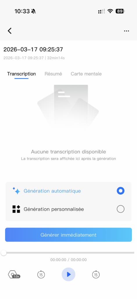 Côté export, c’est complet : 8 formats disponibles (MP3, WAV, DOCX, PDF, TXT, Markdown, JPEG pour les mind maps) et la possibilité de partager via un lien en ligne. Chaque enregistrement est éditable, traduisible et partageable directement depuis l’app. Pour un usage professionnel en équipe, c’est un point fort indéniable. On apprécie aussi la possibilité de marquer des moments-clés pendant l’enregistrement (pression courte sur le bouton) pour retrouver rapidement les passages importants lors de la relecture.