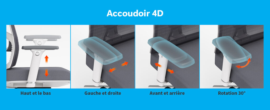 - Accoudoirs réglables en hauteur, en largeur et en orientation (3D)