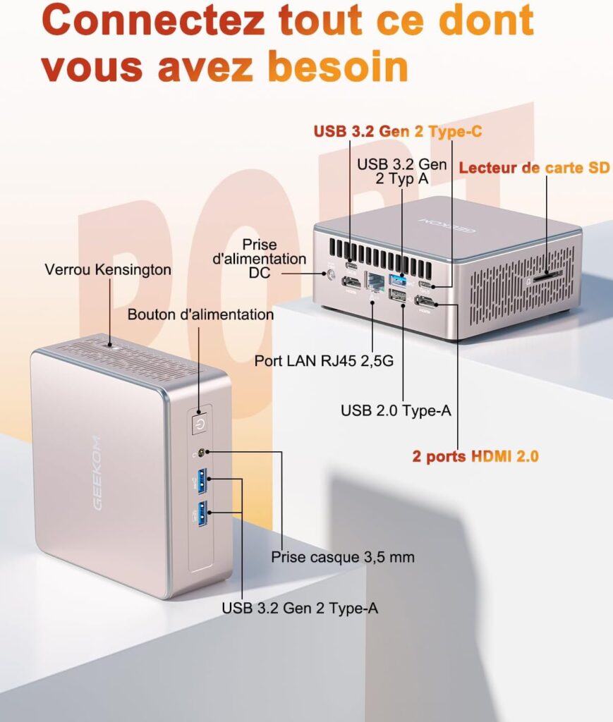 L’un des atouts majeurs du GEEKOM A5 est sa connectique. On retrouve largement de quoi couvrir un usage professionnel ou créatif, avec suffisamment de ports pour connecter plusieurs écrans, des périphériques ou du stockage externe.