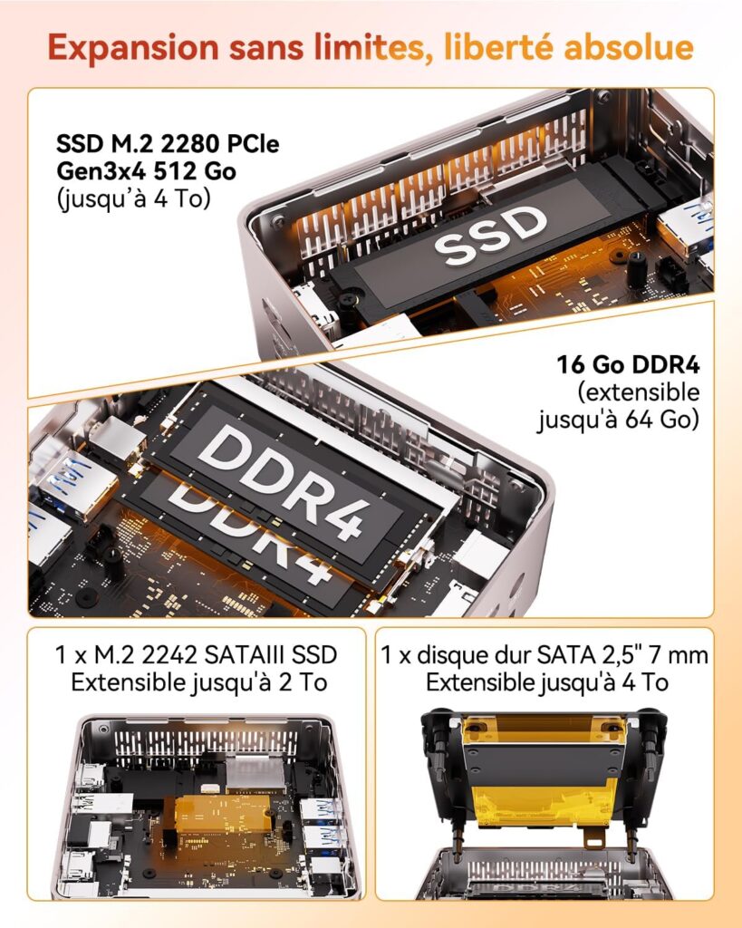 L’accès aux composants internes est simple, et GEEKOM encourage clairement l’utilisateur à faire évoluer la machine. On peut donc remplacer le SSD NVMe par un modèle plus rapide ou plus volumineux, ajouter un disque SATA ou augmenter la mémoire RAM jusqu’à 64 Go. C’est rare pour un mini PC aussi compact et c’est un vrai avantage pour prolonger sa durée de vie.