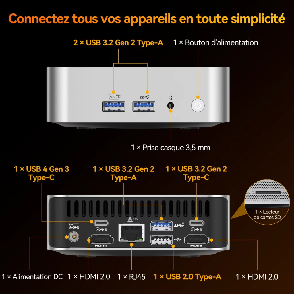 La qualité d’assemblage est au rendez-vous. Le châssis inspire confiance et ne donne jamais l’impression d’un produit fragile, malgré son format réduit. C’est un point important pour un mini PC qui peut être amené à fonctionner de longues heures chaque jour.