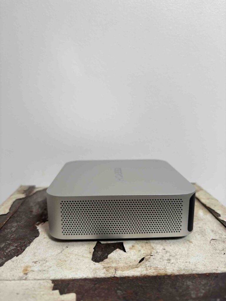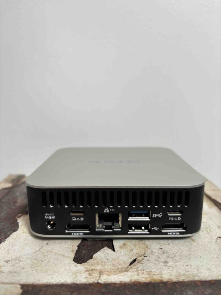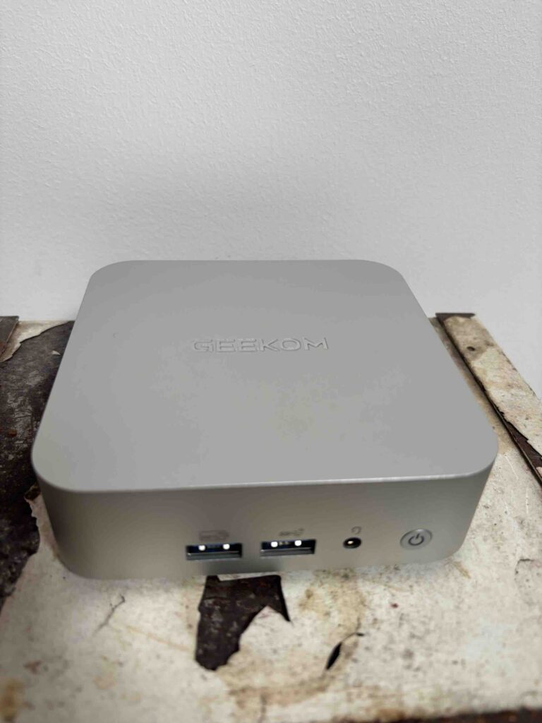 Comme souvent chez GEEKOM, on retrouve un boîtier soigné, élégant, avec une finition gris foncé en aluminium brossé. Le format est ultra-compact : à peine plus de 12 cm de côté et un peu plus de 6 cm de hauteur. Il tient dans la main, se glisse facilement derrière un écran, et s’intègre sans problème dans un setup épuré. La ventilation est discrètement intégrée et les ports bien répartis sur les deux faces. Bref, simple, propre, efficace.