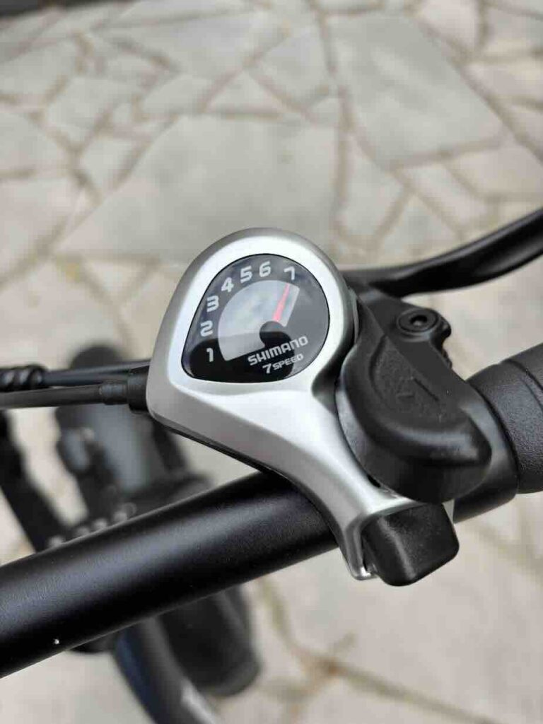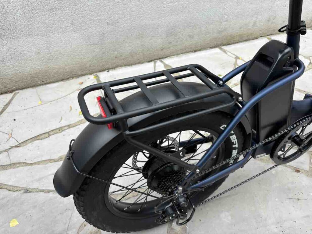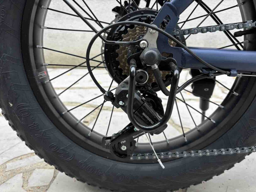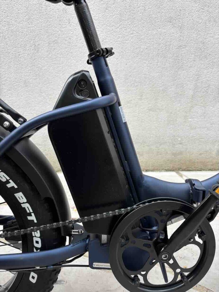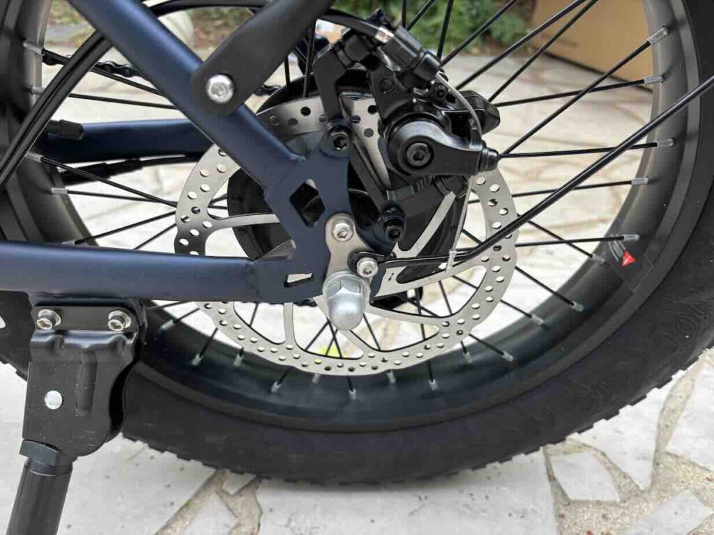 Le pneu fat 20″ offre une bonne absorption des vibrations, même sans suspension centrale. Son comportement en virage est stable, la tenue de route rassurante. On peut l’utiliser sans souci dans un contexte urbain, mais il ne rechigne pas non plus aux sorties plus nature.