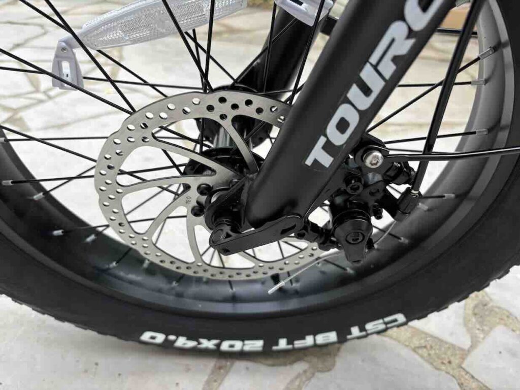 Touroll a équipé son S2 de freins à disque avant et arrière, complétés par un système E-ABS. Ce combo assure une réponse rapide, même sur sol humide ou en descente. Le vélo freine net, sans blocage brutal. C’est sécurisant, surtout quand on dépasse les 25 km/h sur piste cyclable.
