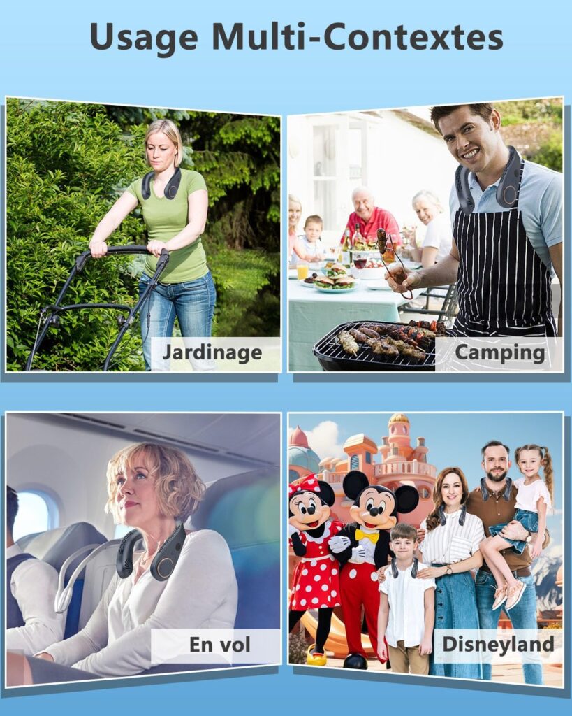 Grâce à ce ventilateur de cou, vous pourrez chasser rapidement les vagues de chaleur pendant l’été. Ce produit offre 5 vitesses de vent. Il propose en plus jusqu’à 12 heures d’autonomie. Ce ventilateur de cou vous permet de vous rafraîchir n’importe où et n’importe quand.