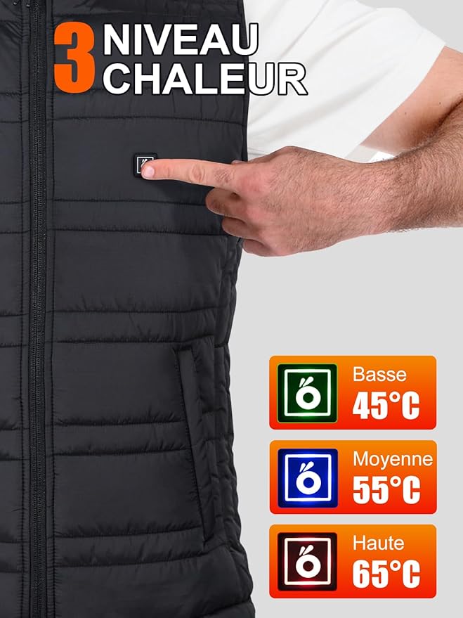 Avec cette veste chauffante aussi élégante que pratique, UNBON vous garantit de pouvoir profiter du grand air tout en ne ressentant pas le froid ambiant. Elle intègre trois niveaux de chauffage et six zones chauffantes. Cette veste vous garde au chaud pendant 8 heures.