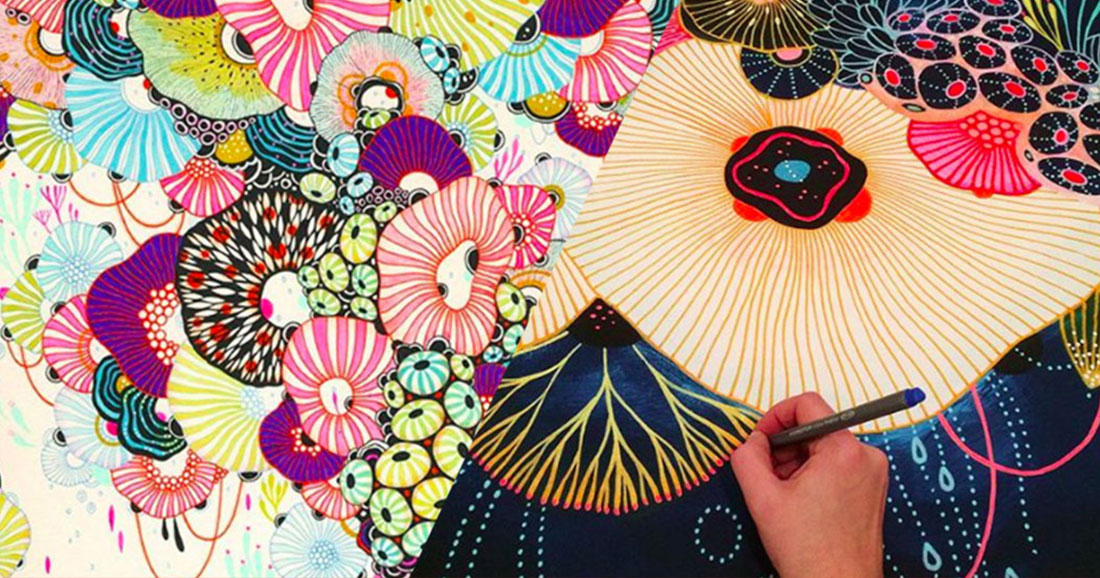 La création de ces œuvres aux mille couleurs passe par l’utilisation d’une large variété de matériaux : un tas de stylos d’encre, d’acrylique et de peinture à la gouache. Le résultat est tout simplement fascinant.